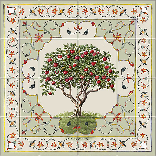 Ez az csempekép egy almafát ábrázol, amely bő termésével a természet bőségét idézi. A fa köré díszes, barokk jellegű virágmintákkal gazdagon keretezett ornamentikus szegély került, amely elegáns és részletgazdag összhatást eredményez. A dekorcsempe falra helyezve kiemelt fókuszpontként működik, jól illik klasszikus, rusztikus vagy mediterrán enteriőrökbe is.
