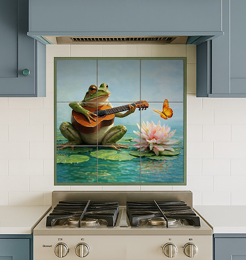Egyedi megjelenésű, humoros hangulatot sugárzó csempekép, mely egy vízparti jelenetet örökít meg. A központi figura egy zöld béka, kezében gitárral, amint zenél a vízen lebegő tavirózsák és leveles növények társaságában. A jelenetet egy repülő pillangó teszi teljessé. Ez a részletgazdag dekorcsempe különleges és játékos atmoszférát teremt a fürdőszobában vagy a konyhai hátfalon.