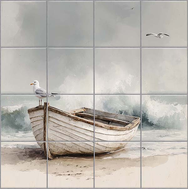 Tengerparti hangulatú dekorcsempe, csónakos csempekép sirállyal és hullámzó tengervízzel.