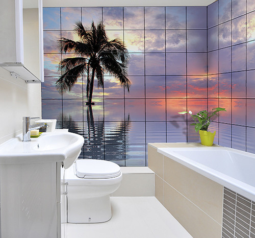 Pálmafa és naplemente mintás fürdőszobai mozaik csempe.
