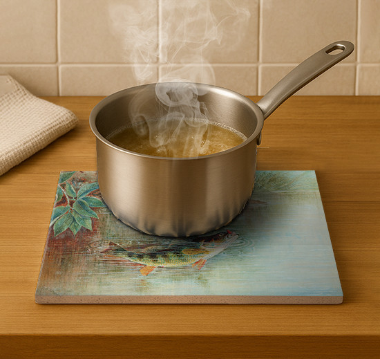 Edényalátétként való használathoz külön kérhető rá parafa talp csúszásgátló, de kiválóan funkcionál parafa talpak nélkül is. Edényalátétként alkalmazva elhelyezhető közvetlenül a tűzhely mellett a forró edények ráhelyezése céljából, vagy étkezőasztalon dekorációnak is.