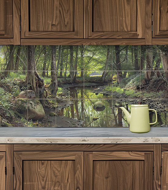 Kerámia csempekép erdei patakkal, fákkal és kövekkel