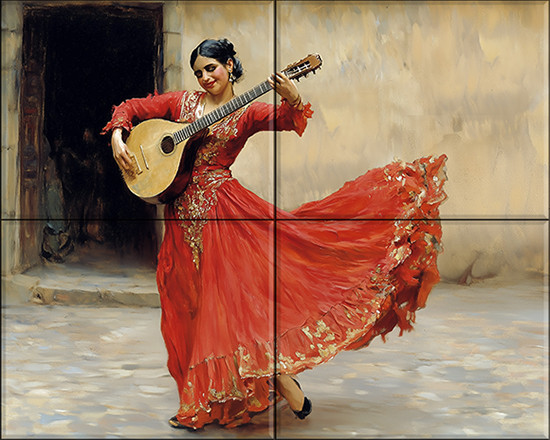 Ez a kerámia csempekép egy igazi flamenco jelenetet idéz meg. A kompozíció középpontjában egy piros, arany hímzéses ruhát viselő táncosnő áll, aki éppen spanyol gitáron játszik. A nő tánc közben lendületesen megpördül, ruhájának fodrai dinamikusan kavarognak körülötte, ami a mozgás és szenvedély élményét nyújtja. A háttér semleges vakolt fal, amely még inkább kiemeli a táncos energikus alakját.