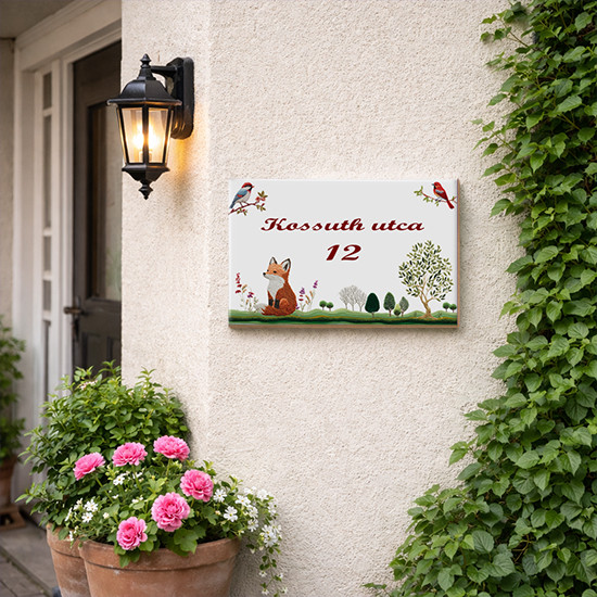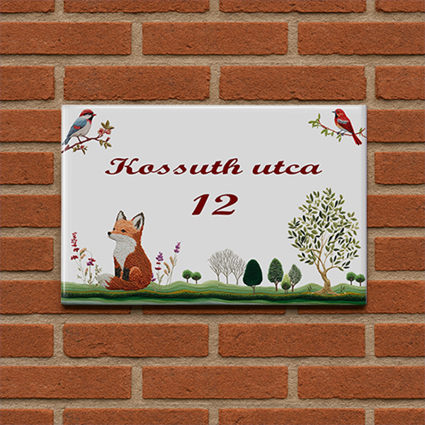 Kerámia házszámtábla róka madár és fa motívummal