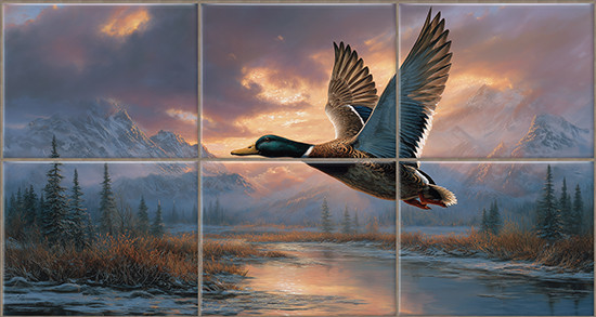 Repülő vadkacsát ábrázoló dekorcsempe hegyvidéki tájjal