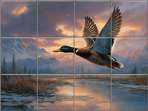 Látványos, természet ihlette kerámia dekorcsempe, amely repülés közben ábrázolt vadkacsát jelenít meg hegyekkel, fenyvesekkel és vízparti tájjal kiegészítve. A meleg naplemente-színek és a részletgazdag kidolgozás dinamikus, mégis harmonikus összhatást teremtenek.