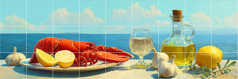 Kerámia csempekép tenger gyümölcsei mediterrán ábrázolással. Vörös homár citrommal egy tányéron, fokhagymafejek, olívaolaj, fehérboros pohár, tengerparti háttér, napsütéses mediterrán hangulat.