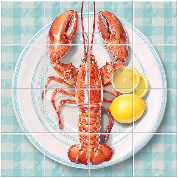 Fali csempe tálalásra kész homár ábrázolással, citromkarikákkal, tányéron, kockás abrosz háttérrel.