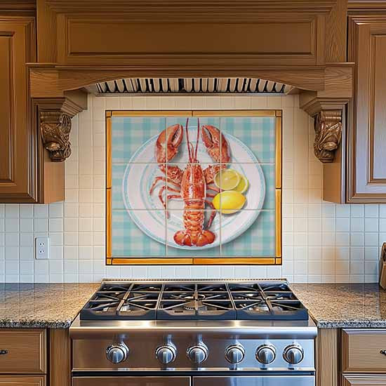 Ez az egyedi dekorcsempe egy főtt homárt jelenít meg klasszikus tálalásban, fehér porcelántányéron, citrommal, világoskék-fehér kockás abrosz háttérrel. A részletgazdag ábrázolás különleges hangulatot teremt konyhákban, vendéglátóhelyeken vagy tenger gyümölcseire specializálódott bisztrókban. Különösen ajánlott tengerparti életérzést közvetítő enteriőrökhöz. A csempe harmonikusan illeszkedik gasztronómiai témájú térbe.