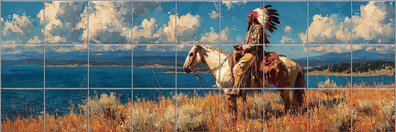 Kerámia fali csempe - egy amerikai indián férfi lóháton, amint egy tavat figyel a vadregényes síkságon. A látványt tágas égbolt, fodros felhők és víztükröt körülvevő sásmező teszi teljessé. Ez a dekorcsempe tökéletes választás lehet tematikus helyiségekbe, éttermekbe vagy otthoni enteriőrbe.