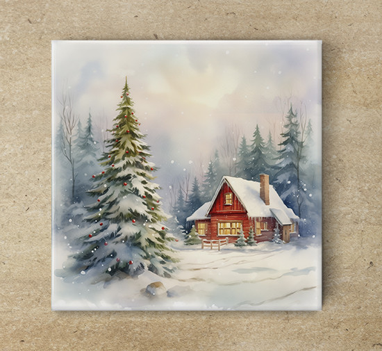 Kerámia edényalátét csempe, dekorcsempe karácsonyfa, fenyőfa, havas kert motívummal.