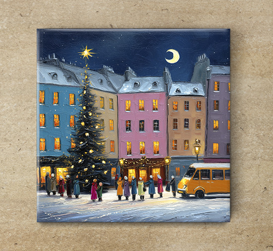 Kerámia edényalátét csempe, dekorcsempe karácsonyfa, fenyőfa, havas város motívummal.