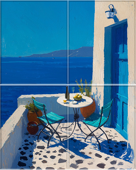 Ez a fali csempekép egy klasszikus görög tengerparti jelenetet idéz meg. A kompozíció középpontjában egy fehér erkély áll, amelyen egy kerek asztal és két türkiz szék látható. Az asztalon egy borospalack, két pohár, valamint egy gyümölcsös tál díszítik a hangulatot. A háttérben a végtelen, mélykék tenger és a távoli szigetek látványa tárul elénk, míg a kék ajtó és zsalugáterek autentikus Santorini jellegű görög stílust sugallnak.