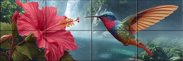Kolibri és hibiszkusz mintás fali csempe – Trópusi dekorcsempe vízeséssel