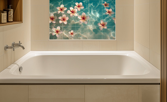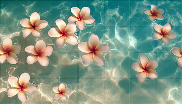 Ez a különleges hatású dekorcsempe nyugalmat és természetközeli szépséget sugároz: plumeria (frangipáni) virágok lebegnek egy kristálytiszta, fényben csillogó türkizkék víz felszínén. A virágok lágy árnyalatai – rózsaszín, krémfehér és sárga tónusok – finoman tükröződnek a vízfelszínen, amit a napsugár játékos reflexiói tesznek még különlegesebbé.