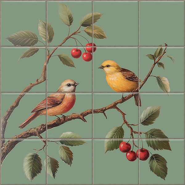 Ez a természetes hangulatú csempekép két színes madarat ábrázol, akik egy cseresznyefa ágán ülnek. A madarak tollazata, valamint a pirosló cseresznyék és zöld levelek elegáns, klasszikus hatást keltenek. A kép zöld háttere kiemeli a motívumokat, így harmonikusan illeszkedik romantikus, klasszikus vagy vidéki enteriőrökbe. A dekoráció több kerámia alapcsempéből épül fel mozaikszerűen. Kiváló választás konyhai hátfalra, fürdőszobai falfelületre vagy bútorfront díszítésére is.