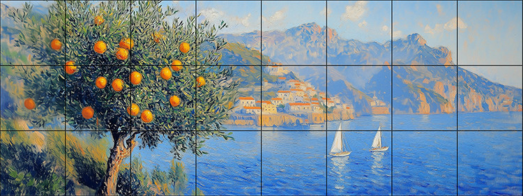 Mediterrán csempekép: előtérben egy gyümölcsökkel teli narancsfa áll a domboldalon, mögötte pedig a csillogó kék tenger és a part menti település fehér és terrakotta színű házai láthatók. A vízen két fehér vitorlás siklik, a háttérben pedig festői hegyláncok emelkednek.