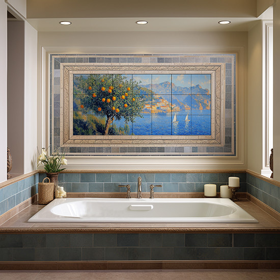 Impresszionista stílusú mediterrán tájkép mintás csempe narancsfával és tengerrel.