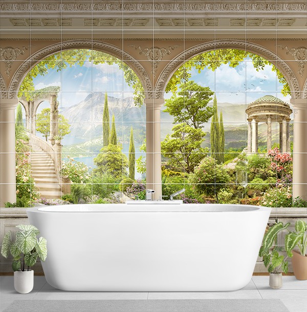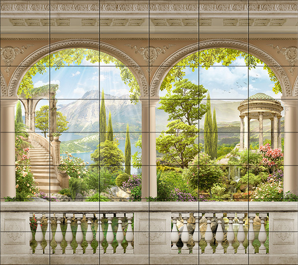 Ez az exkluzív klasszikus csempekép egy gazdagon díszített, oszlopos mediterrán terasz látványát kínálja, melyen keresztül festői kilátás nyílik egy kristálytiszta vizű tóra és a háttérben magasodó hegyekre. A bal oldalon egy monumentális, íves lépcsősor vezet egy romos árkádsorhoz, míg a jobb oldalon egy antik kör alakú pavilon, kőoszlopokkal övezve, trónol a dús növényzet között. A kompozíciót ciprusfák, rózsabokrok, sziklakert, valamint a boltíveken kúszó zöld indák teszik élővé és romantikussá.