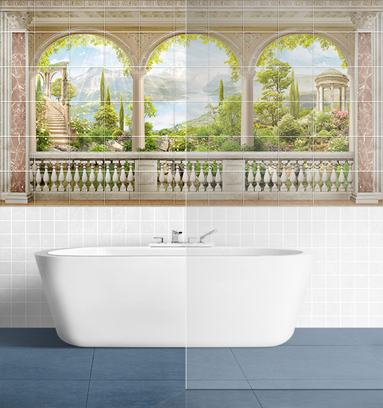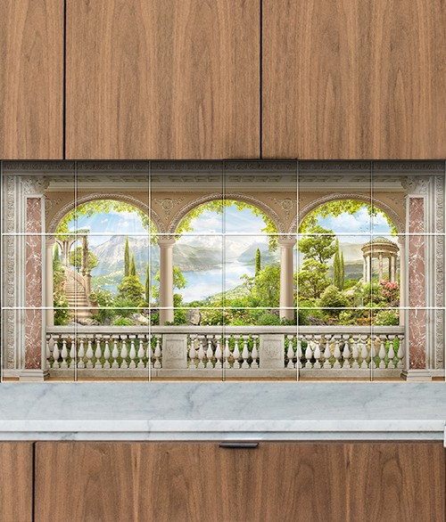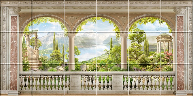 Ez az elegánskerámia csempekép egy gazdagon díszített klasszikus teraszt ábrázol, amelyen keresztül lélegzetelállító kilátás nyílik a csillogó kék tóra, az azt övező zöld hegyekre, valamint egy antik pavilonra és egy romantikus íves lépcsőre. A három klasszikus boltív, a faragott oszlopok és a márvány hatású keret időtlen eleganciát árasztanak. A kilátást ciprusfák, virágzó bokrok, árnyas fák, valamint a mészkő korlát teszik még látványosabbá.