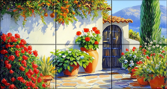 Ez a mediterrán csempekép egy napsütötte teraszt ábrázol, amelyben a fehérre meszelt fal előtt gazdagon virágzó piros muskátlik, hibiszkuszok és zöld levelű növények sorakoznak terrakotta cserepekben. A jelenetet egy antikolt faajtó, boltíves bejárattal, valamint egy hegyekkel övezett háttér teszi teljessé. A mediterrán kőburkolat és a ciprusfa tovább fokozza a toszkán hangulatot.