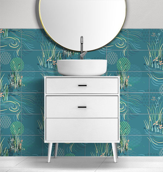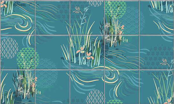 Ez a letisztult stílusú csempekép különféle vízinövényeket, nádas motívumokat, stilizált tavirózsákat és hullámzó vízfelületet jelenít meg kékeszöld alapon. A geometrikus formákkal és visszafogott pasztellszínekkel díszített kompozíció harmonikus, modern összhatást kelt. A dekorcsempe kiválóan alkalmazható olyan enteriőrökben, ahol természetközeli, mégis kortárs vizuális világot szeretnénk megvalósítani – különösen fürdőszobákban, wellness terekben vagy pihenősarkokban.