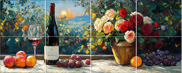 Mozaik csempe impresszionista stílusú bor, rózsa, gyümölcs mintával.