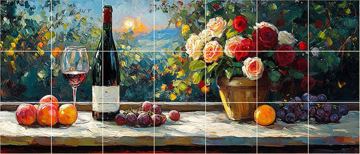 Mozaik csempe impresszionista stílusú bor, rózsa, gyümölcs mintával.