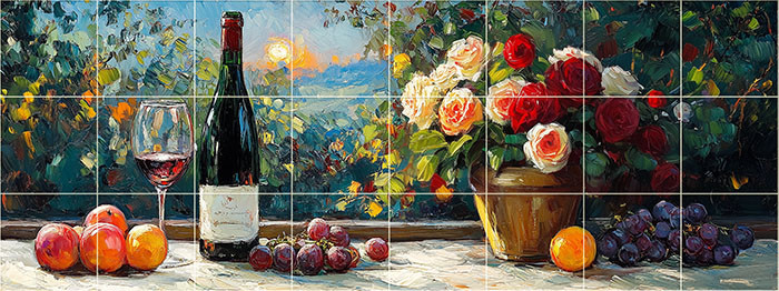 Ez a festmény hatású csempekép egy idilli kertet ábrázol naplementében. Az előtérben egy terített asztal látható, amelyen egy üveg vörösbor, egy pohár bor, valamint szőlő, narancs kapott helyet. A kompozíciót egy rusztikus cserépben elhelyezett rózsacsokor teszi teljessé, amely fehér, rózsaszín és vörös szirmokkal díszíti a jelenetet. A háttérben sejtelmesen feltűnik a lemenő nap, mely meleg fénnyel borítja be a zöldellő kertet.