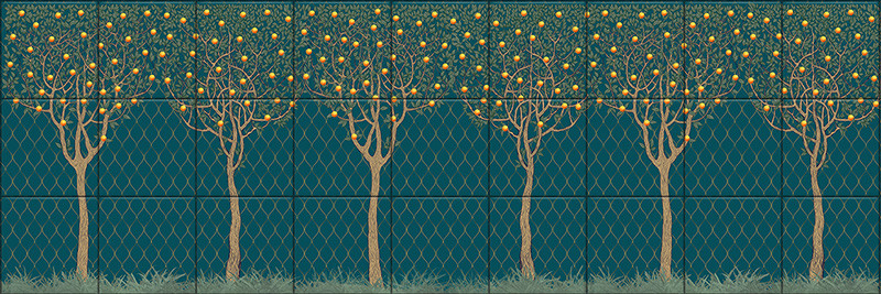 Különleges hangulatú, stilizált kerámia csempekép narancsfákkal és aranyló narancsokkal. A háttér mély smaragdzöld, rácsszerű mintázattal. Természetes, de egyben geometrikus hatást kelt.