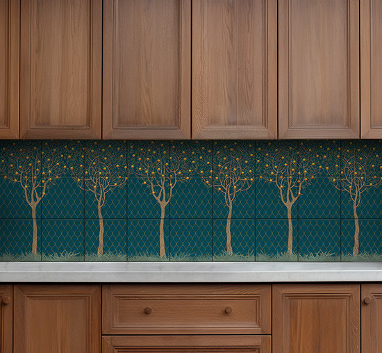 Letisztult, dekoratív kerámia csempekép stilizált narancsfákkal sötétzöld háttérrel – modern mediterrán hangulat otthonra vagy vendéglátóhelyre.