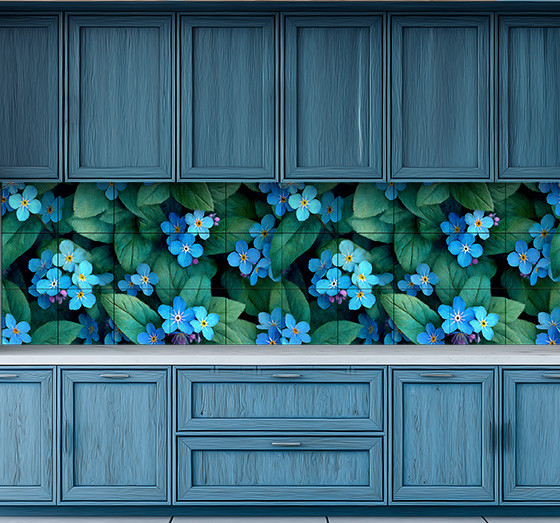 Ez a részletgazdag csempekép kék nefelejcs virágokat és sötétzöld, természetes hatású leveleket ábrázol. A kompozíció a klasszikus és romantikus enteriőrök dísze lehet, különösen jól mutat konyhai hátfalként, fürdőszobai falburkolatként, de akár bútor előlapokon is alkalmazható. A kép mozaikszerűen, több kerámia alapcsempe felhasználásával áll össze, így nagyobb felületeken is karakteres vizuális fókuszpontot alkot. Kiváló választás otthoni vagy vendéglátóipari terekbe, ahol különleges, természetközeli látványvilágra van igény.