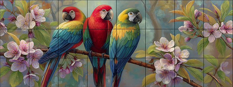 Ez a kerámia csempekép három gyönyörű, színpompás papagájt ábrázol, akik egy virágzó faágon üldögélnek. A vörös, zöld, sárga és kék színekben tündöklő madarak között rózsaszín és fehér virágok bontanak szirmot, megelevenítve a trópusok varázsát. Ideális választás olyan helyiségekbe, ahol a természet közelségét és a vibráló színeket szeretnéd viszontlátni: legyen szó fürdőszobáról, étkezőről vagy wellness tér kialakításáról. A dekorcsempe látványos fókuszponttá válik bármely enteriőrben.