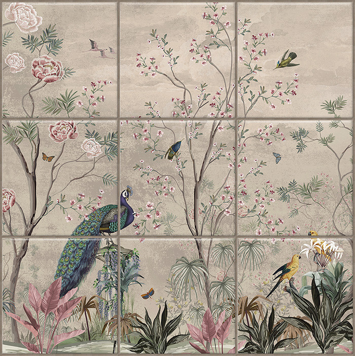 Ez a részletgazdag, finoman megkomponált dekorcsempe egy különleges enteriőr éke lehet. A klasszikus stílusú kompozícióban egy páva áll a kép középpontjában, amelyet színes trópusi madarak, repkedő pillangók, finom peóniák, virágzó faágak, és sűrű növényzet vesz körül. Az elegáns háttér és a természet motívumai harmonikus összhatást keltenek, tökéletes választás lehet egy vintage vagy keleties hangulatú helyiség fali díszítéséhez.