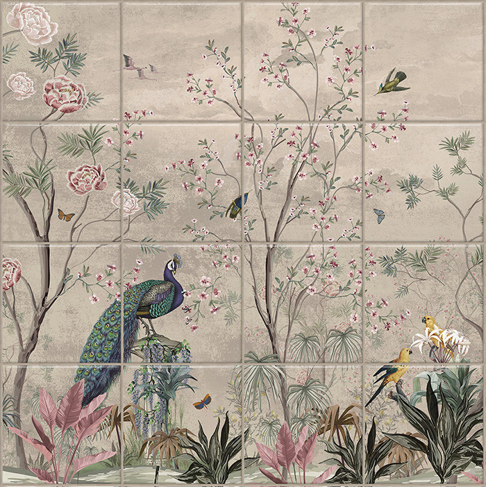 Elegáns csempekép, amelyen pávák, pillangók, trópusi madarak, virágzó fák, peóniák és egzotikus növények jelennek meg részletgazdag illusztrációban.