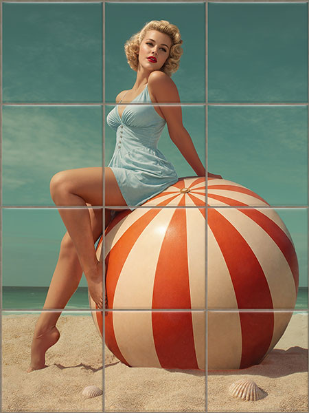 Pin-up lány csíkos labdával a strandon mintás fali csempekép.