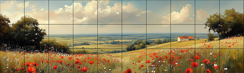 Ez a kerámia fali csempekép egy idilli, nyári vidéki tájat mutat be, ahol élénkvörös pipacsok, fehér vadvirágok és zöldellő mezők sorakoznak egymás után. A távolban egy magányos tanya látható a domboldalon, a háttérben pedig kék horizont és felhős égbolt zárja le a látképet. A természet szépsége és a nyugalom jelenik meg ezen a részletgazdag dekorcsempén, amely kiváló választás falra, konyhába, étkezőbe vagy nyaralóba.