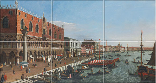 Ez a fali csempekép a történelmi Velence egyik csatornáját örökíti meg, amelyet gyönyörűen kidolgozott, reneszánsz stílusú paloták szegélyeznek. A kompozícióban hangsúlyosak a díszes homlokzatok, íves ablakok, valamint a víztükör, amely visszatükrözi az épületek meleg tónusait. A jelenet nyugodt, napsütéses hangulatot áraszt, és egy kisebb csónak is feltűnik a csatorna vizén, ami tovább fokozza a romantikus, időtlen atmoszférát.