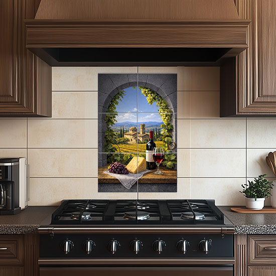 Kerámia dekorcsempe ablakos Toszkán tájképpel, szőlővel és borral. Mediterrán stílusú falburkolat konyhába vagy fürdőszobába.