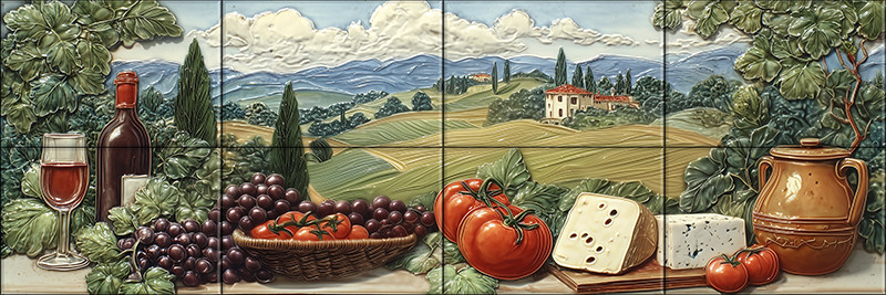 Ez a Toszkán stílusú fali csempe egy gazdag, ízekkel és látvánnyal teli pillanatot örökít meg a mediterrán vidékről. A háttérben dombos táj, ciprusokkal szegélyezett mezők, olasz villák, míg az előtérben vörösboros üveg és pohár, egy kosár zamatos szőlő, érett paradicsomok, valamint kétféle sajt kaptak helyet. A kompozíciót egy rusztikus agyagedény és szőlőlevelek egészítik ki, mintha egy toszkán teraszról tekintenénk a tájra.
