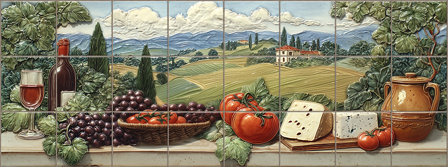 Ez a Toszkán stílusú fali csempe egy gazdag, ízekkel és látvánnyal teli pillanatot örökít meg a mediterrán vidékről. A háttérben dombos táj, ciprusokkal szegélyezett mezők, olasz villák, míg az előtérben vörösboros üveg és pohár, egy kosár zamatos szőlő, érett paradicsomok, valamint kétféle sajt kaptak helyet. A kompozíciót egy rusztikus agyagedény és szőlőlevelek egészítik ki, mintha egy toszkán teraszról tekintenénk a tájra.