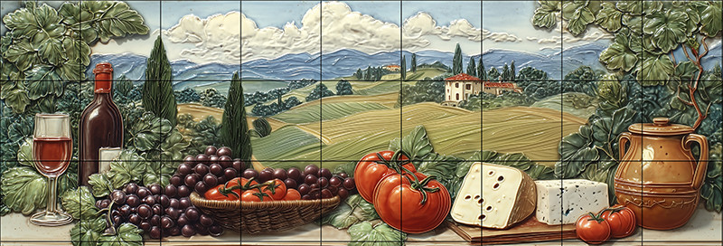 Ez a Toszkán stílusú fali csempe egy gazdag, ízekkel és látvánnyal teli pillanatot örökít meg a mediterrán vidékről. A háttérben dombos táj, ciprusokkal szegélyezett mezők, olasz villák, míg az előtérben vörösboros üveg és pohár, egy kosár zamatos szőlő, érett paradicsomok, valamint kétféle sajt kaptak helyet. A kompozíciót egy rusztikus agyagedény és szőlőlevelek egészítik ki, mintha egy toszkán teraszról tekintenénk a tájra.