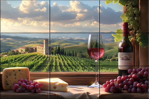 Toszkán szőlőültetvények borospohárral, rosé borral, szőlőfürtökkel és sajtokkal – klasszikus mediterrán hangulatú dekorcsempe.