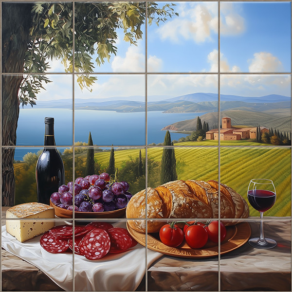 Részletgazdag dekorcsempe, amely a toszkán tájra jellemző idilli hangulatot idézi meg. A csempekép előterében egy megterített kőasztal látható: szőlő, paradicsom, sajt, kolbász, friss parasztkenyér és vörösbor szerepel rajta. A háttérben dombos vidék, szőlőskertek, tenger, ciprusfák és egy román stílusú templom látható. Ideális választás konyhába vagy étkezőbe, ahol egy mediterrán hangulatot árasztó dekorcsempe látványa különleges atmoszférát teremt.