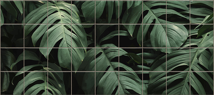 Ez a sötét tónusú, esztétikusan komponált csempekép nagy méretű, buja monstera leveleket ábrázol, melyek egy trópusi dzsungel hangulatát idézik. A gazdag növényzet mélyzöld árnyalatai természetközeli atmoszférát teremtenek a térben. A dekorcsempe ideális választás olyan belső terekbe, ahol fontos a természetes látvány és a vizuális nyugalom. Fürdőszobába, wellness terekbe vagy zöld tematikájú konyhákba különösen ajánlott.