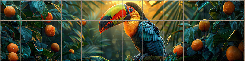 Ez a lenyűgöző trópusi mmintás kerámia csempekép egy élénk színű tukánt ábrázol, amint egy mohos ágon pihen az esőerdő mélyén. A háttérben buja zöld levelek, aranyló napfény, valamint narancssárga bogyókkal teli ágak teszik teljessé a kompozíciót. A madár színkavalkádja – sárga, narancs, zöld és fekete árnyalatokban – garantáltan a tér fókuszpontjává válik. Ez a részletgazdag dekorcsempe ideális választás olyan helyiségekbe, ahol egyedi, egzotikus hangulatot szeretnél teremteni, legyen szó konyháról, fürdőszobáról, konyháról vagy wellness szobáról.