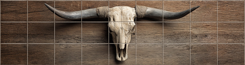 Ez a karakteres csempekép egy bikakoponyát ábrázol, amelyet egy természetes, texturált fa háttér emel ki. A koponya két oldalán elnyúló hosszú szarvak és a részletgazdag farost-mintázat westernes, rusztikus atmoszférát teremt. A kép motívumai markáns látványelemként szolgálnak, így ez a dekorcsempe ideális választás lehet country stílusú vagy férfias enteriőrökbe.