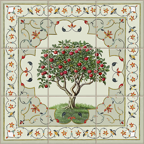 Ez az csempekép egy almafát ábrázol, amely bő termésével a természet bőségét idézi. A fa köré díszes, barokk jellegű virágmintákkal gazdagon keretezett ornamentikus szegély került, amely elegáns és részletgazdag összhatást eredményez. A dekorcsempe falra helyezve kiemelt fókuszpontként működik, jól illik klasszikus, rusztikus vagy mediterrán enteriőrökbe is.