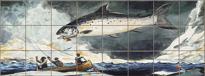 This striking tile mural is based on a painting by Winslow Homer, showing a dramatic scene on the water. At the center, a massive fish dominates the composition, seemingly suspended above the stormy sea. In the foreground, several fishermen struggle in a small boat against the waves, emphasizing the raw power of nature. The turbulent sky and foaming water create a sense of tension and energy. This ceramic tile mural is perfect for lovers of marine and fishing-themed artwork.