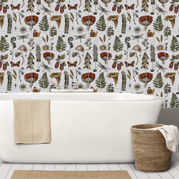 This illustrated ceramic tile mural displays a wide range of forest-themed elements, including several types of mushrooms (such as red-capped fly agaric), wildflowers like daisies, ferns, raspberries, a dragonfly, a butterfly, and a charming snail. The naturalistic style and detailed imagery make this tile mural ideal for botanical, rustic, or eclectic interior spaces.